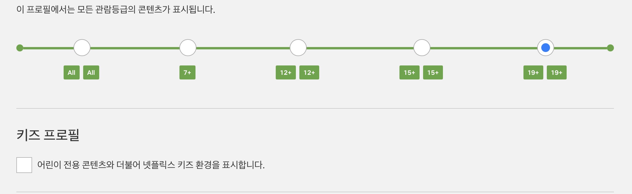 관람등급을 설정할 수 있습니다. 어린이 전용콘텐츠만 나오도록 하고 싶으시면 키즈프로필로 선택하시면 됩니다.